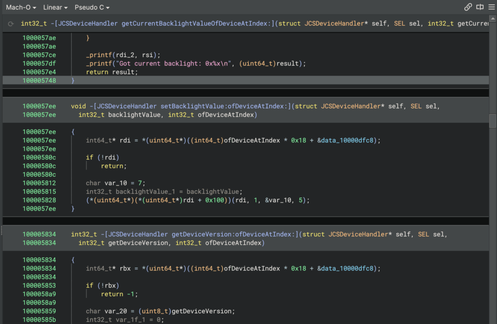 Negative. I didn’t spot anything, so it’ll take a little more grunt work. I did run their helper app through a disassembler and spotted functions like getting and setting the backlight via IOKit which were all expected. It wasn’t necessary to go this far, it just confirms that we have some USB packet snooping to do.
